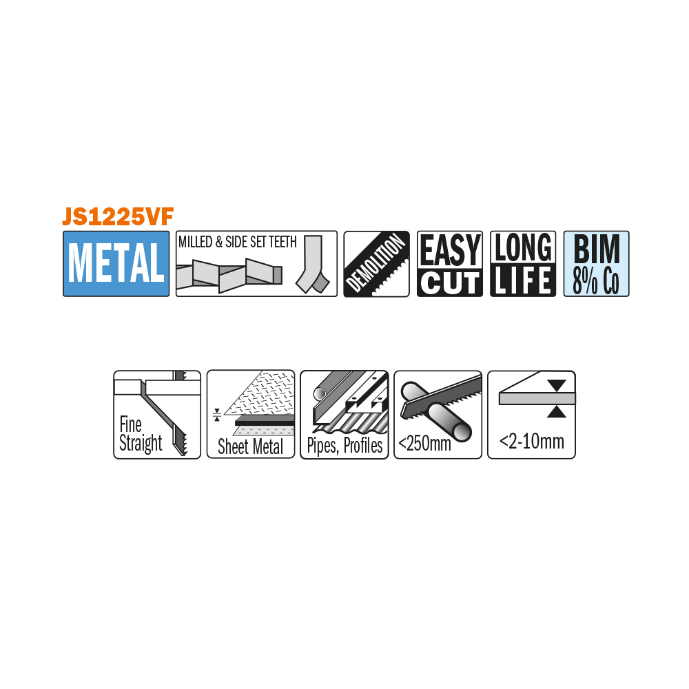 Bajonettsagblad for kutting av middels tykke til tykke metallplater fra 2 mm til 10 mm (5/64″ – 3/8″) i tykkelse. Tynne til tykkveggede rør og profiler med mindre enn 250 mm (10″) i tykkelse. Ideell for rivningsarbeid.