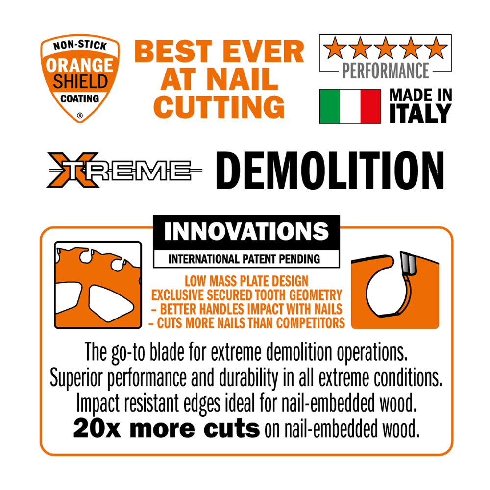 Dette sirkelsagbladet gir 20 ganger flere kutt enn konkurrerende blader. Dens lavmasseplate og den eksklusive sikrede tanngeometrien gjør dette rivningsbladet ekstremt motstandsdyktig mot treff med metallelementer i treverket, for perfekt glatte og presise kutt.